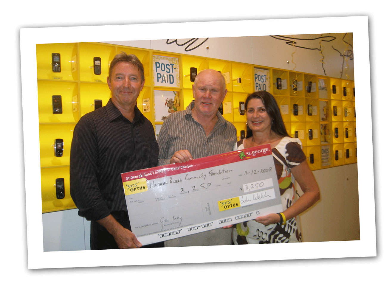 At the opening of Yes, Optus Byron Bay. From left, owner John Welch with his donation to the Byron Shire Community Fund, NRCF Director John Bennett and Byron Shire Mayor, Jan Barham.